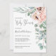 A beautifully feminine baby shower invitation featuring a corner bouquet of watercolor poppies, roses, eucalyptus and trailing greenery in soft pastel beige, pink, green and blue-green. Trendy type face pairings include handwritten script and elegant serif. This invitation is a great choice for the mother-to-be who is expecting a baby girl. Personalise the easy to use text template with your event details.