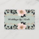 Two soft, pink wild rose blossoms and their vines border a gold frame on a sage-green background, creating a stylish and professional business card for a wedding or event planner. Could be used for a wedding chapel or a romantic B and B, as well.