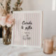Cute whimsical hand drawn French cafe inspired baby shower cards and gifts sign with a soft pink striped background and a hand drawn illustration of a bib, bow and baby shoes.
