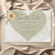 Embrace the free-spirited charm of boho elegance with our enchanting wedding save the date card. Featuring a soothing sage green watercolor wash background, the centerpiece is a darker sage green heart adorned with clusters of soft yellow, brown, and sage green sunflowers. The modern script font heading and clean, casual body text offer a contemporary touch, perfectly balancing style and ease. This design beautifully captures the essence of your love story, inviting your guests to celebrate in a setting of natural beauty and relaxed sophistication. Sunflower graphics created by Verya Studios. Created by Simply Farmhouse Press.