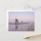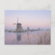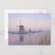 Postcard of a fairy tale landscape with old windmills in the soft pastel light of a winter sunrise with ice on the river and frost on the reeds on a cold morning in Kinderdyke, the Netherlands.
