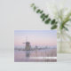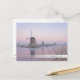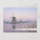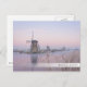 Postcard of a fairy tale landscape with old windmills in the soft pastel light of a winter sunrise with ice on the river and frost on the reeds on a cold morning in Kinderdyke, the Netherlands with a fading bar and the text 'Holland'.