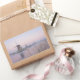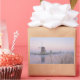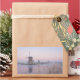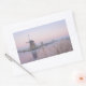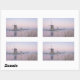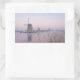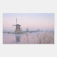 Rectangular photo sticker with a fairy tale landscape with old windmills in the soft pastel light of a winter sunrise with ice on the river and frost on the reeds on a cold morning in Kinderdyke, the Netherlands.