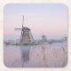 Coaster with a fairy tale landscape with old windmills in the soft pastel light of a winter sunrise with ice on the river and frost on the reeds on a cold morning in Kinderdyke, the Netherlands.