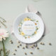 A Round frame of watercolor wild flowers, leaves, and daisies in soft watercolor palette of ivory white, sage green, yellow and orange adorn this romantic and gender neutral baby shower monogrammed paper plates.
