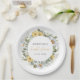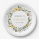 A Round frame of watercolor wild flowers, leaves, and daisies in soft watercolor palette of ivory white, sage green, yellow and orange adorn this romantic and rustic chic bridal shower monogrammed paper plates.