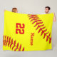 PERSONALIZED Softball Fleece Blankets with close up glassy look Softball Stitches and her NAME and Jersey NUMBER or Monogram or Delete it. * (Matching Softball Throw Pillow below). To Change Background or Text Colours to ANY COLORS.