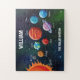 Educational solar system puzzle for kids who are space fans! Each star or planet is labelled with name. Includes sun, mercury, venus, earth, mars, jupiter, saturn, uranus, and neptune in proper order. Cool colourful galaxy background. Add child's name to personalise!