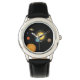 This watch provides the illusion of gazing into deep space with the luminous earth and sun in your line of sight. These planets are original drawings by Mozartini and are also available as wall, floor, and window decals so you can make your own dramatic planetary arrangements.