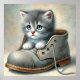 This artwork depicts a heartwarming scene of a fluffy grey kitten nestled inside a worn-out leather shoe. The kitten's big, blue eyes seem to hold a hint of curiosity and perhaps a touch of loneliness. The contrast between the tiny kitten and the large shoe creates a sense of wonder and adds to the charm of the image.