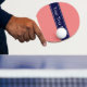 Solid Light Coral, Navy Blue Ribbon Name Monogram Ping Pong Paddle