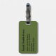 Luggage tag with name and address on a solid olive green background colour. Personalise with your name and address information using the easy templates. Font colour, font style, and font size are customisable.