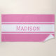 Enjoy this personalised beach towel at the beach or poolside. This design has a solid pink background colour with white stripes and a modern font. This is a terrific gift for family vacations, parties, or events. The name and colour can be customised in the personalisation options.