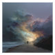 A lone figure strides down a misty coastal path straight into a colossal, glowing storm cloud that towers over the sea like a radiant portal. Layers of turquoise, teal, lavender, indigo, and blazing orange-gold swirl with inner light, while gentle waves reflect rose and silver fragments along rocky shores. Thick fog veils distant cliffs, amplifying depth, solitude, wonder, and quiet resolve. The scene radiates introspection, courage at life’s thresholds, transformation, awe before nature’s sublime power, and the beauty of moving forward into the unknown—perfect for meditation rooms, bedrooms, home offices, therapy spaces, modern minimalist decor, or as deeply symbolic gifts for anyone embracing change, personal growth, spiritual journeys, resilience, or quiet strength.