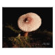 A battered mushroom stands alone in a sunbeam of the quiet forest.