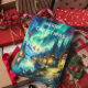 A serene painting depicting a rustic cabin nestled among tall trees in a tranquil forest setting.