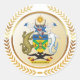 The coat of arms of the Solomon Islands is infused into a faux gold rimmed circle shape which itself, is set amid a faux gold laurel wreath.