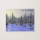 Features an image of the mid-winter taiga (boreal forest). Cold and covered in snow. Low on the horizon a pale, yellow sun hovers just above the mountains. A snowshoe hare runs for cover in the foreground. Add your own text.