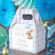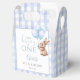 These charming 1st birthday party favor boxes feature a cute bunny holding balloons and a blue gingham background. Designed by Thisisnotme©