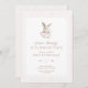 A timeless vintage bunny illustration with soft neutral color palette and delicate pink ribbon detail. Designed for a sweet first birthday celebration with a classic stripe background and elegant typography. Great for invitations, party decor, and keepsake prints.