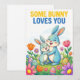 Sweet Easter greeting card featuring an affectionate parent and baby bunny illustration surrounded by spring flowers and decorated Easter eggs. The message “Some Bunny Loves You” makes this card ideal for parents, grandparents, and family members sharing a warm Easter sentiment with a child or loved one. Soft pastel colors and playful characters give it broad appeal for Easter and spring gifting.