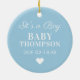 Holiday ornament design for an expecting couple features a light blue background with round quote "Some gifts are worth waiting for!" and space for a maternity, ultrasound, or other photo. The back of the ornament includes custom "It's a Boy" text with baby's last name and due date that can be personalised. This ornament makes a great surprise pregnancy announcement for future grandparents, and also a memorable keepsake for the parents to be. Note, the blue colour can be customised. Photo tip: crop your photo to a square shape prior to upload.