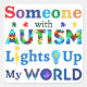 Inspirational quote of “Someone with AUTISM Lights Up My WORLD” with colourful Autism puzzles, a symbolic light bulb and lighting on the message to support autistic children and their families.