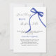 An elegant white background, decorated with dark blue bow. Personalise and add a name and party details.
