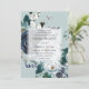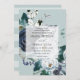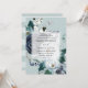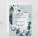 Elegant and modern boho chic floral wedding invitation features a background of delicate watercolor spring flowers in blue, dusty blue, white and ivory.