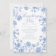 The back showcases a seamless blue floral toile pattern, completing the design with refined vintage flair. Perfect for Something Blue, Chinoiserie, French Country, or Blue & White themed bridal showers, this invitation suits spring, summer, fall, or winter celebrations with grace and elegance.🌸🌿