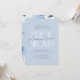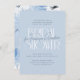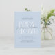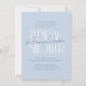 A dusty blue bridal shower invitation with bold typography and handwritten script lettering. The front of the card features a light blue background, with "Bridal shower" written in white deco-inspired typography. The bride-to-be's name is written in chic modern calligraphy over it. Above and below, the event details appear in elegant formal serif typography. The cards reverse to a watercolor floral pattern. View the collection linked on this page for matching items or visit our store for more bridal shower invitation designs!