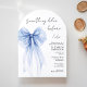 Elegant arch-shaped bridal shower invitation featuring a watercolor of a large blue coquette bow and "something blue before I do" in a chic script.