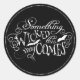 Delightfully wicked design of intricate lettering reads, "Something wicked this way comes". White typography on classic black, this sticker makes a lovely cupcake topper, or seal on your Costume Party invitations!