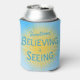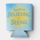 This uplifting message shines boldly on this insulated can cooler with the words “Sometimes Believing is Seeing” bursting forth in a radiant blue—the colour of a bright new day. The phrase emerges from a golden sun, its rays lighting up the soft sky-blue background, just like faith lights the way before the dawn.