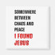 Stylish, minimalist Christian magnet with inspirational text reading SOMEWHERE BETWEEN CHAOS AND PEACE I FOUND JESUS in bold black and red typography, Matching gifts available.