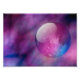 Against a backdrop of royal blue and intricate hot pink clouds like distant galaxies is a single smooth glass orb with a swirling fractal suspended inside.