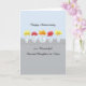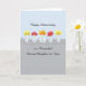 This simple and modern design features a row of flowers in clear vases.Grey is at the bottom of the card, with light blue at the top for a fresh look. Perfect card to send anniversary wishes to celebrate with your son and "daughter". Appropriate whether it be for their first anniversary or 25 years!