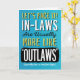 Wish your Son-in-law a happy birthday by complimenting him with this fun card featuring this message: Let's Face it! In-laws are usually more like "OUTLAWS" (Especially Sons-in-Law! Just Sayin'). Design appears in bold white, yellow, and black letters on blue background. Inside has this message but can be customised with your own message. Thankfully, having a son-in-law as WONDERFUL as you makes you an EXCEPTION to this rule! Hope your birthday is great!