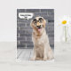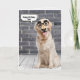 Golden retriever wearing a funny moustache mask on grey brick wall and wood floor with speech bubble for Son's birthday.