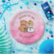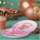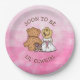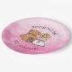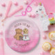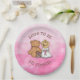 Country and western themed rustic girl's baby shower paper plates. Graphics are a cute little baby girl in a cowboy hat sitting next to a teddy bear. Pink background. Baby Shower paper plates.