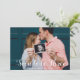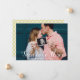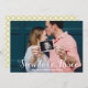 Photo Overlay Soon to be Three Custom Pregnancy Announcement. Deliver the great news for your new family member being on the way with a personalised photo card with your own photo and an overlay script Soon to be Three and custom text on the front. The back is a modern geometric x pattern in mustard and white.