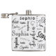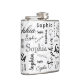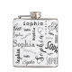 A typography custom name flask for Sophia's favourite drink.. The initial script "S" makes a decorative pattern in the background. Her name features a mixture of fun lettering and striking contrasting colours of black, white and grey. This personalised makes a great gift choice for any occasion that calls for high spirits.