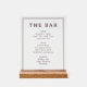 This elegant wedding menu features a classic and sophisticated design with a clean, white background that highlights the central text elements. The layout is vertically oriented, utilizing a serif font for a timeless feel, with "THE BAR" prominently displayed at the top in bold letters. Sections for "BEER," "WINE," and "SPIRITS" are neatly organized, each separated by subtle horizontal lines, creating a refined and professional look ideal for any formal event. The minimalistic color palette of black on white enhances readability and conveys an atmosphere of sophistication and simplicity.