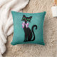 Sophisticated Black Cat green Eyes Pink Bow Aqua Cushion