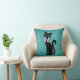 This decorative pillow has a sophisticated black cat wearing a pink bow with big green eyes on an aqua blue background.