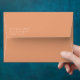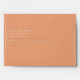 This wedding envelope features a minimalist design with a warm terracotta background, creating an inviting and elegant atmosphere. The centered white text is crisp and clean, utilizing a modern sans-serif font that enhances readability and adds a touch of sophistication. With ample negative space around the text, the layout emphasizes clarity and focus, making it perfect for formal correspondence. The overall style is understated yet refined, ideal for couples seeking a simple yet stylish presentation for their special day.