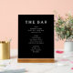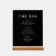 This elegant wedding menu features a minimalist, text-centric design with a solid black background and crisp white serif typography. The layout is clean and organized, divided into three sections labeled "Beer," "Wine," and "Spirits," each listing various options in a simple, readable format. The modern style emphasizes sophistication and clarity, making it perfect for a stylish bar setup at your special event. The use of negative space enhances the focus on the offerings, creating an inviting and professional atmosphere.