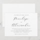 This elegant wedding invitation features a clean, minimalist design with ample white space and a classic black-on-white colour palette. The layout is vertically aligned, emphasizing clarity and sophistication through the use of serif fonts in varying sizes to create a hierarchy of information. The central focus is on the names, presented in a large, flowing script font that adds a personal touch, while the rest of the text provides essential details about the event in a modest, uppercase typeface. The overall mood is one of refined tradition, making it perfect for formal celebrations.