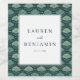 These elegant wedding wine labels feature a sophisticated botanical theme with a dark green background adorned by stylised leaf motifs in a grid pattern. The central white square, framed by a thin black line, showcases classic serif typography for the names and date, creating a refined and harmonious look. Perfect for celebrating your special day, these labels convey a mood of tranquillity and renewal, making them an ideal choice for couples looking to add a touch of nature-inspired elegance to their wedding favours.