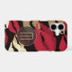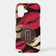 Beautiful and glamourous for her, this phone case features a background pattern of red and gold lip images on dramatic black. Your monogram is at the lower centre in light gold, placed on a semi transparent circle banner that is also lined in thin gold. She will love this case!